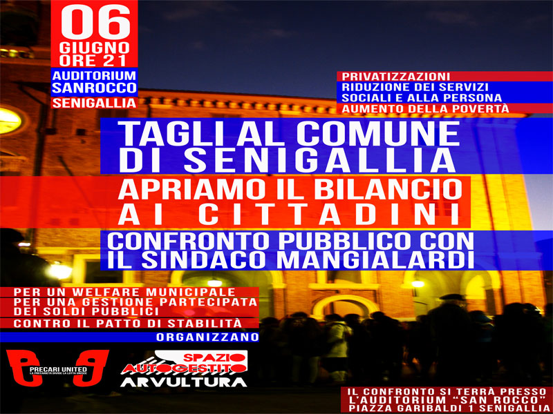 Giovedì 6 giugno alle ore 21:00 presso l’auditorium San Rocco, incontreremo il Sindaco Mangialardi per un confronto pubblico su come Senigallia possa resistere al patto di stabilità e quindi evitare tagli e privatizzazioni di ciò che è pubblico.