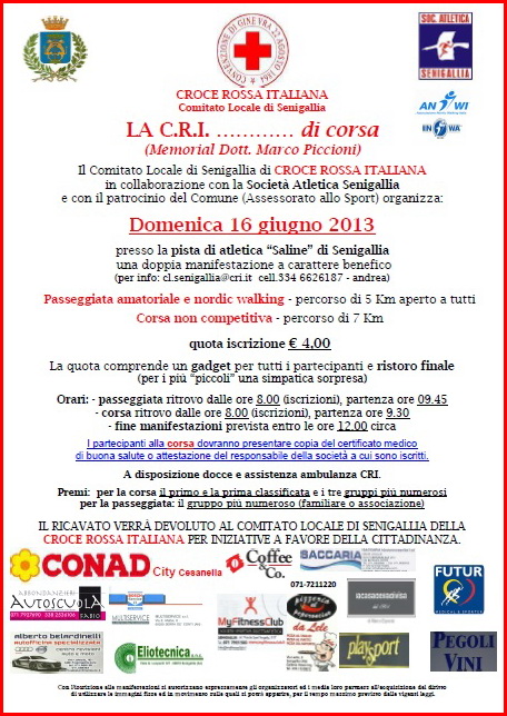 Il Comitato Locale di Senigallia della Croce Rossa Italiana ricorda che domenica 16 giugno, presso la pista di atletica “Saline” di Senigallia, si terrà la 1ª edizione della manifestazione “La C.R.I… di corsa – Memorial Dott. Marco Piccioni”.