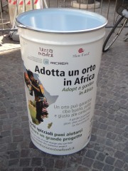 Petrini inoltre fa presente al pubblico che in certi punti della piazza sono presenti dei bidoni per raccogliere fondi la creazione di orti in Africa.
