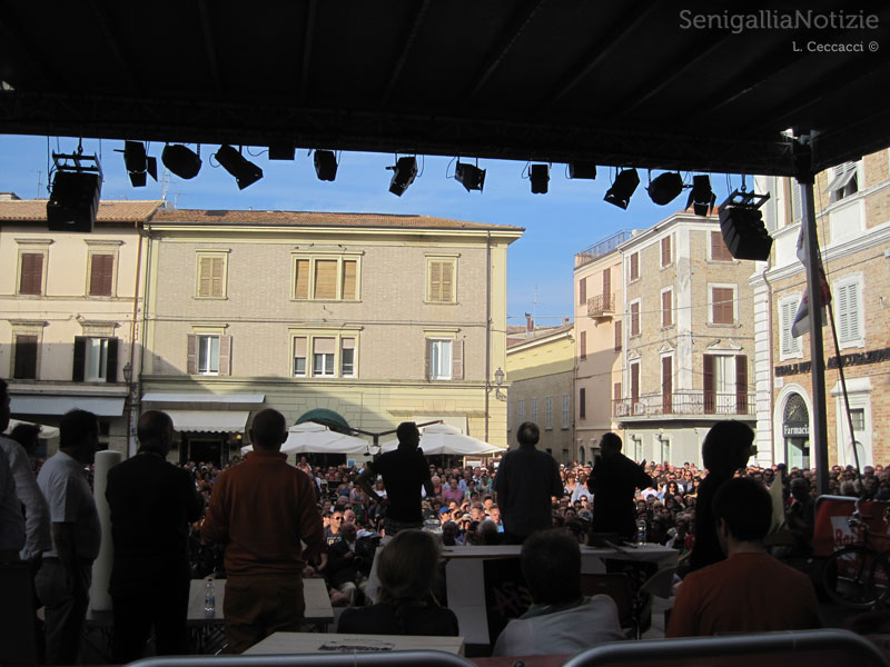 Il palco guarda verso piazza Roma piena per l'Asta della Legalità
