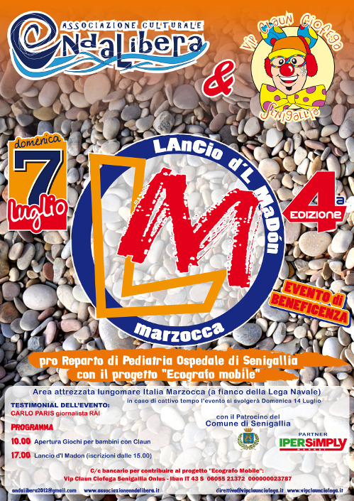 Domenica 7 luglio 2013, presso l’area sul lungomare Italia a Marzocca, si terrà la IV edizione del Lancio d’l Madon, l’evento principale del grande progetto di solidarietà dell’associazione culturale OndaLibera. Progetto a cui quest’anno ha aderito anche un’altra realtà senigalliese, Vip Claun Ciofega, oltre al Comune di Senigallia che ha dato il suo patrocinio e all’Ipersimply.