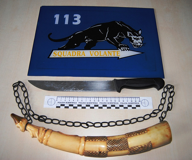 Il coltello da cucina e il corno tribale sequestrati dalla polizia