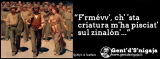 Ovvio per i dissacranti autori di Gent’d’S’nigaja, la valenza assunta dall’opera è di tutt’altro genere. L’affermazione della donna in prima fila, infatti, in italiano suonerebbe: “Fermatevi, che questa creatura mi ha fatto pipì sul grembiule”