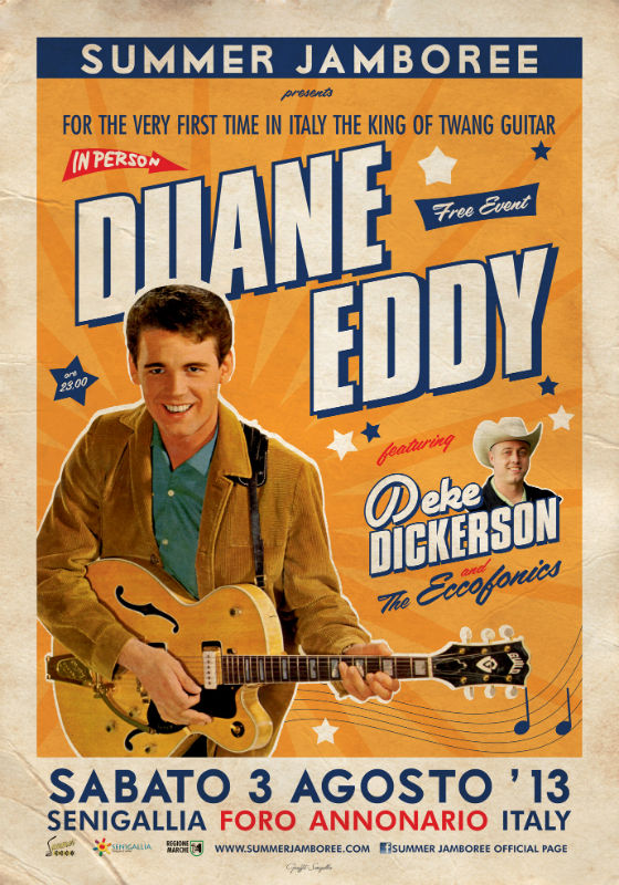 Ospiti internazionali, artisti che hanno scritto la storia degli anni d’oro del rock and roll, autentiche leggende anni Cinquanta, giovani talenti e band che portano avanti l’eredità di uno straordinario fenomeno musicale oltre che sociale, si alterneranno sui tanti palchi allestiti in tutta la città per nove intensi giorni. E si comincia subito alla grande, nella prima serata di Festival, sabato 3 agosto al Foro Annonario, con il big dei big di questa edizione: Duane Eddy (USA). Inizio concerto previsto per le 23.15.