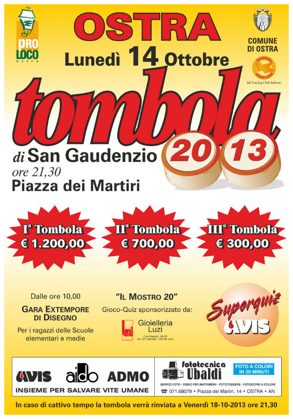 L’estrazione dei numeri sarà inoltre intervallata da alcuni intrattenimenti, come il ‘IL MOSTRO’ gioco di mezza tombola, giunto alla 20 edizione, dove sarà necessario indovinare i vari particolari di un ‘collage’ di personaggi celebri e ‘VINCI CON LA VITA‘ quiz proposto dalle sezioni cittadine dell’AVIS e AIDO con domande attinenti alle attività svolte dai due sodalizi che oramai da tanti anni affiancano la Pro Loco per la migliore organizzazione della manifestazione.