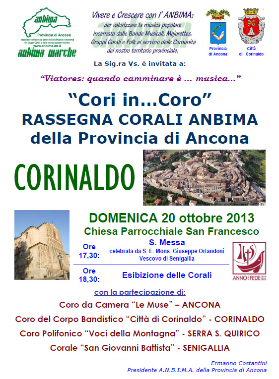 Appuntamento con musica e canto di alta qualità, a Corinaldo. Domenica 20 ottobre l’Anbima Marche (Associazione Nazionale Bande Italiane Musicali Autonome) – un’associazione atta a valorizzare la musica popolare incarnata prevalentemente da Bande Musicali, Majorettes, Gruppi Corali e Folk al servizio delle Comunità del territorio provinciale – porterà nella città la manifestazione “Cori in…Coro”, rassegna delle corali della regione.
