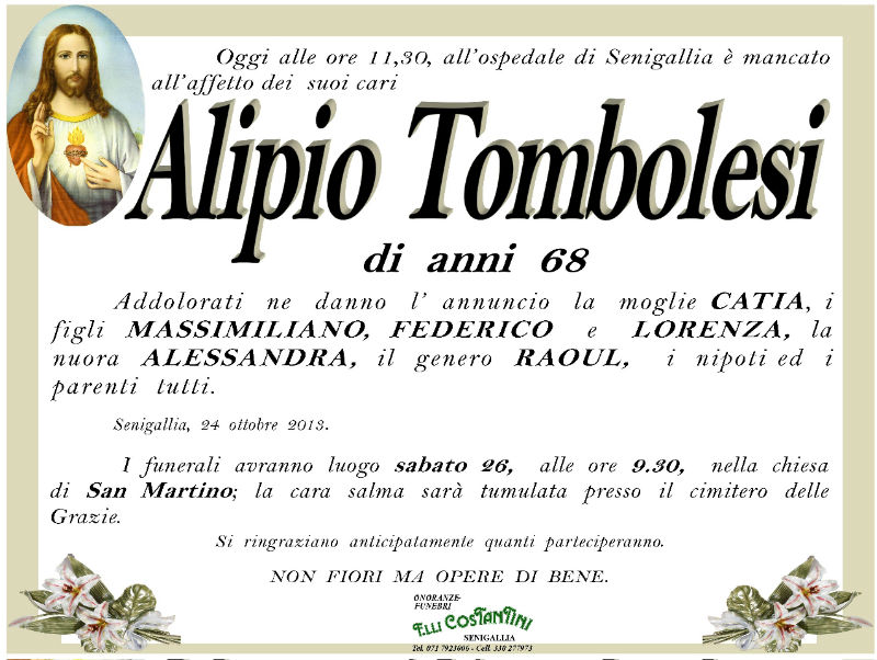 Nella mattinata del 24 ottobre è venuto a mancare all’affetto dei suoi cari Alipio Tombolesi all’età di 68 anni. Addolorati ne danno l’annuncio la moglie Catia, i figli Massimiliano, Federico e Lorenza, la nuora Alessandra, il genero Raul, i nipoti ed i parenti tutti.