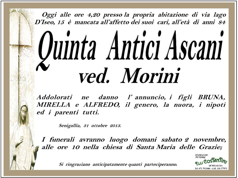 Giovedì 31 ottobre alle ore 4:20 presso la propria abitazione di via lago d’Iseo 15, è mancata all’affetto dei suoi cari, all’età di anni 84, Quinta Antici Ascani ved. Morini.
