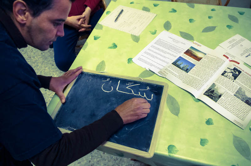 Mohamed Belbaji scrive in arabo alla lavagnetta