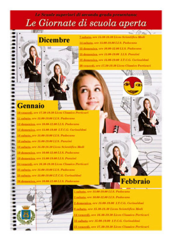 Le scuole superiori di secondo grado di Senigallia si presentano ed aprono le loro porte a studenti e genitori. Pronto il calendario di Scuola aperta che prenderà il via sabato 7 dicembre 2013 al Liceo Scientifico Medi e si concluderà venerdì 21 febbraio 2014 al Liceo Classico Perticari.