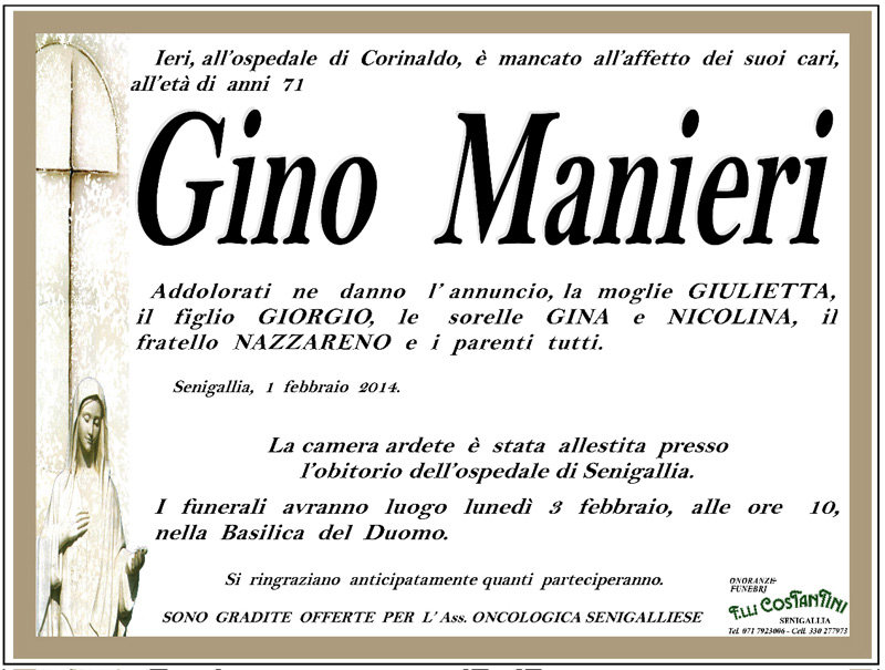 Venerdì 31 gennaio 2014, all’ospedale di Corinaldo, è mancato all’affetto dei suoi cari, all’età di 71 anni Gino Manieri. Addolorati ne danno l’annuncio la moglie Giulietta, il figlio Giorgio, le sorelle Gina e Nicolina, il fratello Nazzareno e i parenti tutti.