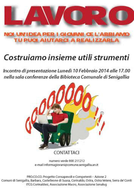 Il progetto “Pro.Co.Co. – Progetto consapevoli e competenti”, cofinanziato dalla Regione Marche (L.R.24/2011), vede il Comune di Senigallia, assessorato alle politiche giovanili, come ente capofila dei comuni associati di Barbara, Castelleone di Suasa, Corinaldo, Ostra, Ostra Vetere e Serra de’ Conti, e la collaborazione dei partner tecnici Associazione Senalug, Istituto Corinaldesi e Macro.