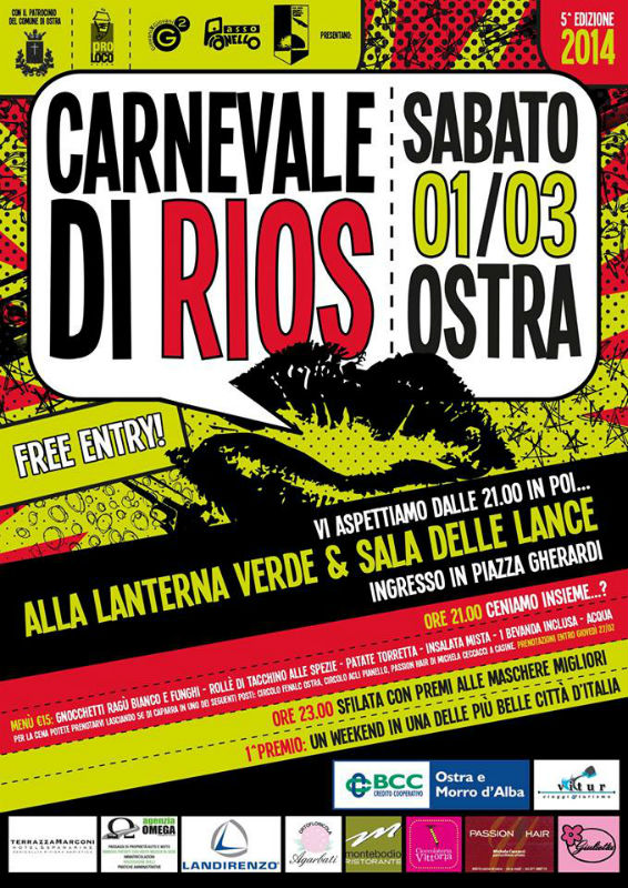 Si terrà sabato 1° marzo la 5^ edizione del Carnevale di Rios. La festa, organizzata grazie agli sforzi delle associazioni G.s. Casine Asd, G2 e Asso Pianello, si svolgerà alla Lanterna Verde & Sala delle Lance dalle 23.00 in poi.