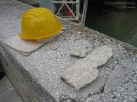 Grazie a un “ponte” mobile, i tecnici sono riusciti a vedere le condizioni del ferro e del calcestruzzo, soggetti da tempo alle svariate condizioni climatiche e all’erosione dell’acqua (come in queste foto), prendendone alcuni frammenti per analizzarli meglio.