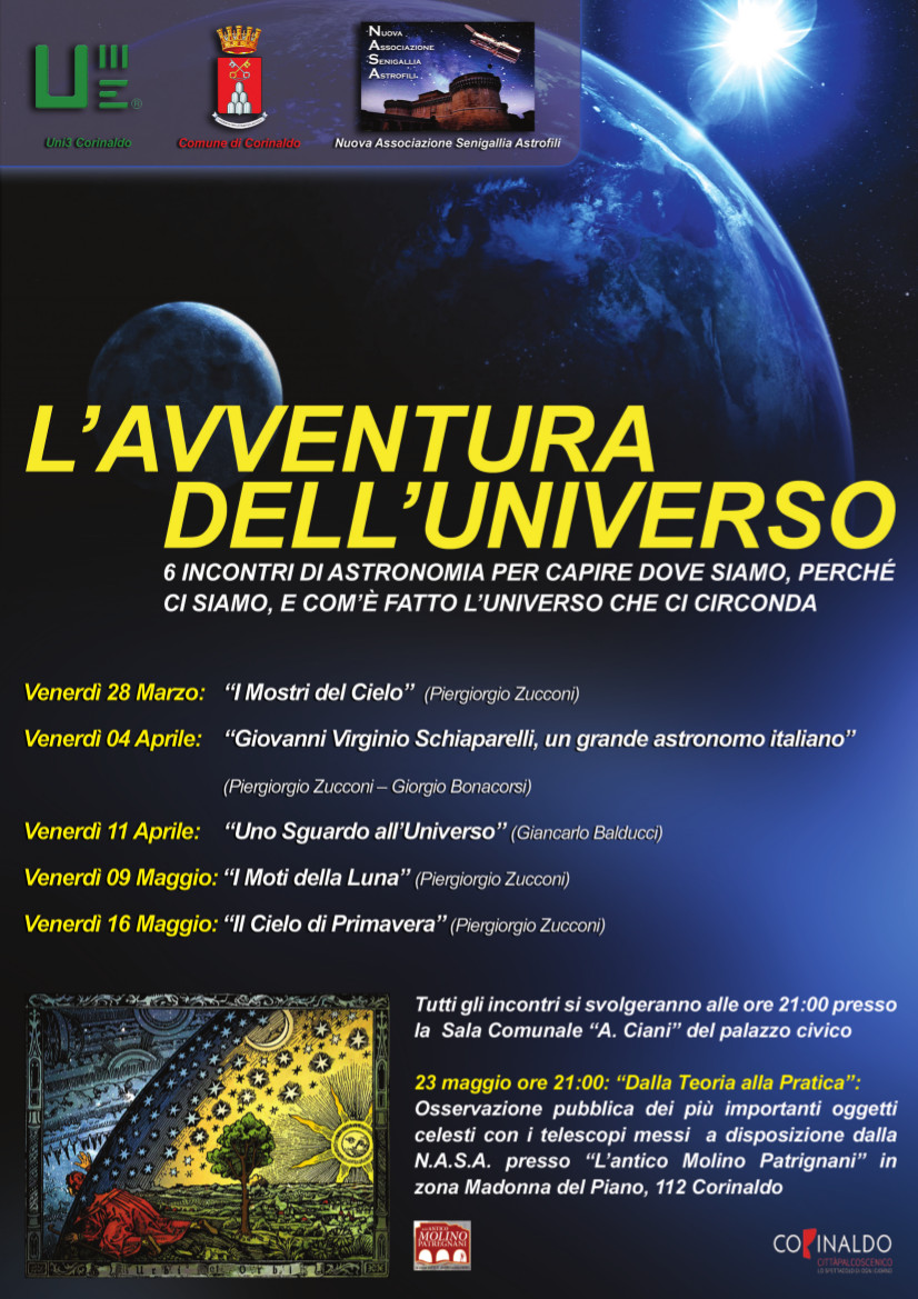 Ultimo appuntamento, a Corinaldo, per quanto riguarda la rassegna di incontri inerenti all’astronomia. La rassegna è denominata “L’Avventura dell’Universo. Sei incontri di astronomia per capire dove siamo, perché ci siamo e com’è fatto l’universo che ci circonda”.