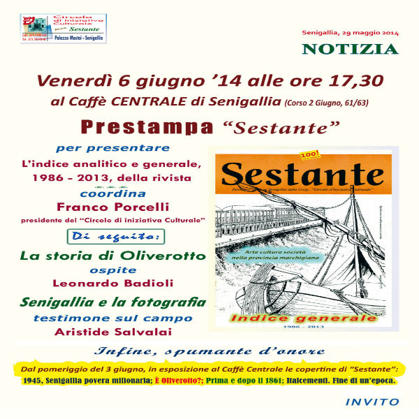 Il prossimo venerdì 6 giugno alle ore 17,30 al Caffè Centrale di Senigallia il Circolo presenterà, in prestampa, l’indice analitico e generale di tutti i numeri pubblicati della rivista “Sestante”.