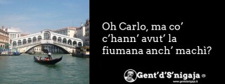 La città lagunare è nel mirino dei nostri autori, ma forse ancora di più lo sono i due sprovveduti e spaesati turisti, ovviamente senigalliesi, che si trovano a girare in gondola sul Canal Grande. La traduzione italiana della frase è: “Ehi Carlo, ma anche qui hanno avuto la fiumana?”