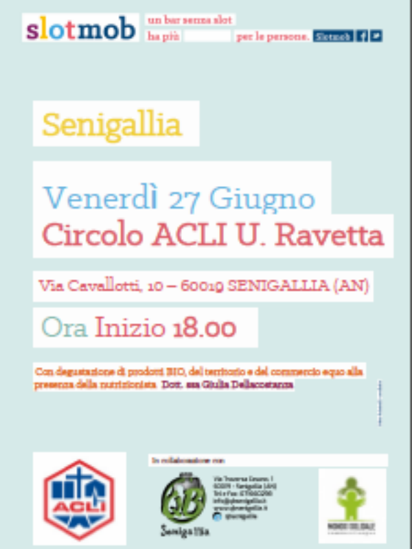 Il Caterraduno 2014 a Senigallia promuove SLOTMOB presso il Circolo ACLI “U. Ravetta” di via Cavallotti 10 (piazza Duomo), venerdi 27 dalle ore 1 8.00. SLOTMOB – Cittadini mobilitati contro le slot-machine contro le nuove povertà e la dipendenza dal gioco d’azzardo.