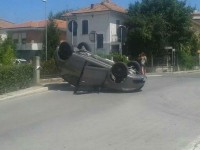 Spettacolare incidente tra due auto, Lancia si cappotta a Senigallia