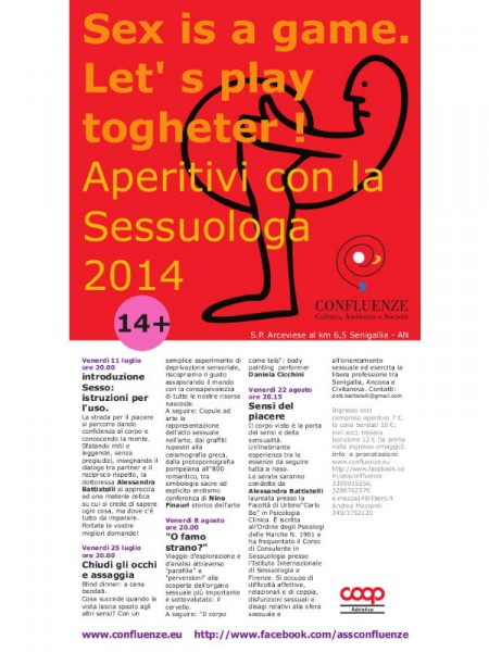 Domande pruriginose (ma legittime) per neofiti o sexnauti esperti, al terzo appuntamento degli Aperitivi con la Sessuologa ’14, intitolato non a caso “O famo strano?”, venerdì 8 agosto nella sede di Confluenze, strada Arceviese km 6,5 di fianco a Spoga arredamenti.
