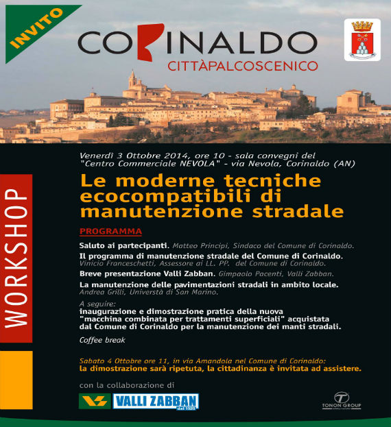 La manutenzione delle strade al centro dell’attenzione dell’Amministrazione Comunale. Venerdì mattina 3 ottobre alle ore 10.00, presso la sala convegni del centro commerciale “Nevola” di Corinaldo si terrà l’incontro dal titolo “Le moderne tecniche ecocompatibili di manutenzione stradale”.