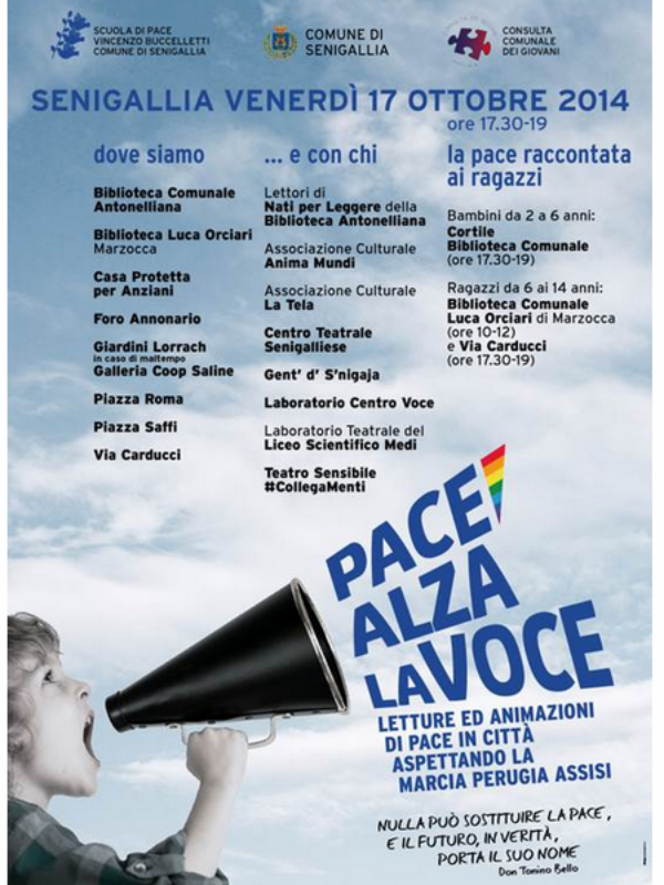 Nella giornata di venerdì 17 ottobre dalle 17.30 alle 19.00 in diverse zone della città prenderà vita l’iniziativa “Pace alza la voce” promossa dal Comune senigalliese, dalla Scuola di Pace ‘Vincenzo Buccelletti” e dalla Consulta Comunale dei Giovani.