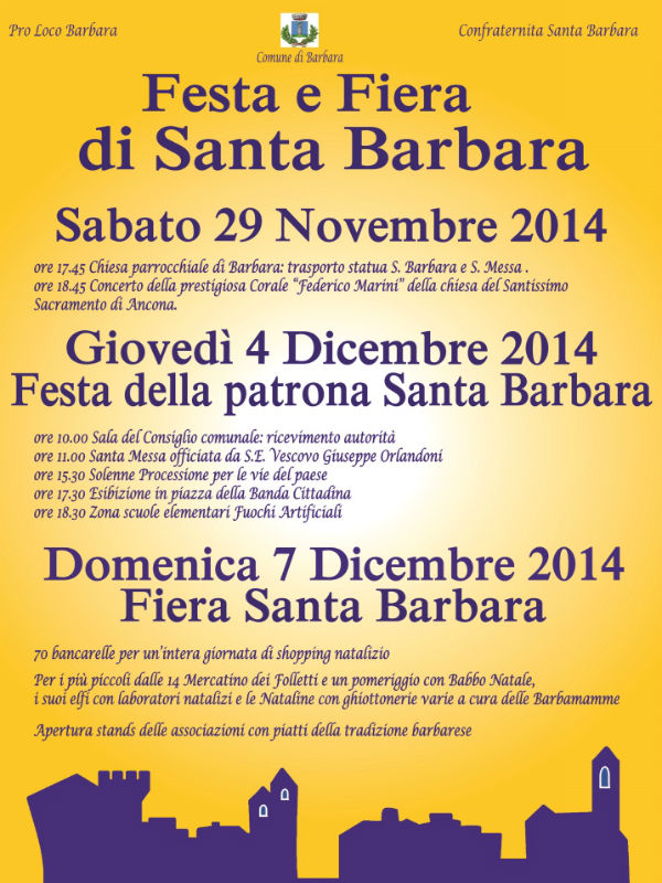 Sabato 29 novembre è in programma già il primo evento alla chiesa parrocchiale di Barbara e la cittadina si animerà con il concerto della Corale “Federico Marini” di Ancona: infatti, dopo il trasporto della statua di Santa Barbara e la Santa Messa, seguirà alle ore 18:45 il menzionato concerto.