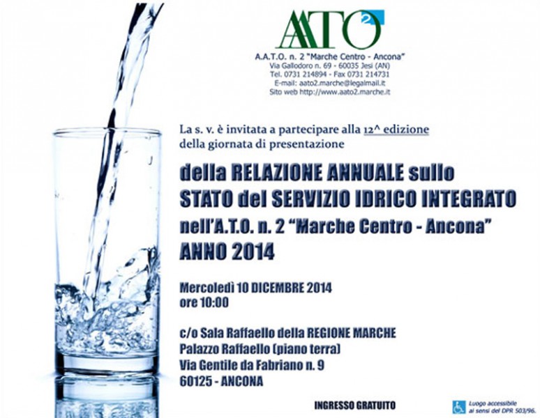 Si terrà mercoledì 10 dicembre ad Ancona la giornata di presentazione della relazione annuale sullo stato del servizio idrico integrato nell’A.A.T.O. n. 2 “Marche Centro – Ancona“.