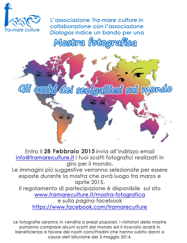 L’associazione di promozione sociale “Tra-mare culture“, in collaborazione con l’associazione culturale “Dialogos”, ha organizzato e indetto un bando per la mostra fotografica dal titolo “Gli occhi dei senigalliesi sul mondo” da realizzarsi nei mesi di marzo e aprile 2015.