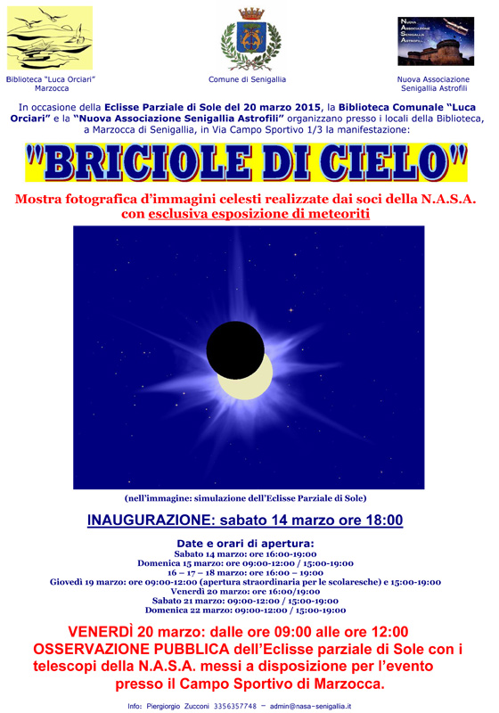Nuova iniziativa della N.A.S.A., Nuova Associazione Senigallia Astrofili. In occasione dell’imminente eclisse parziale di sole, che sarà visibile il 20 marzo 2015, dalle ore 9,27 alle ore 11,47 circa, con copertura del 65% del disco solare da parte della luna, ha organizzato assieme alla Biblioteca Comunale “Luca Orciari” di Marzocca una mostra fotografica arricchita da un’esclusiva esposizione di rari frammenti di meteoriti.