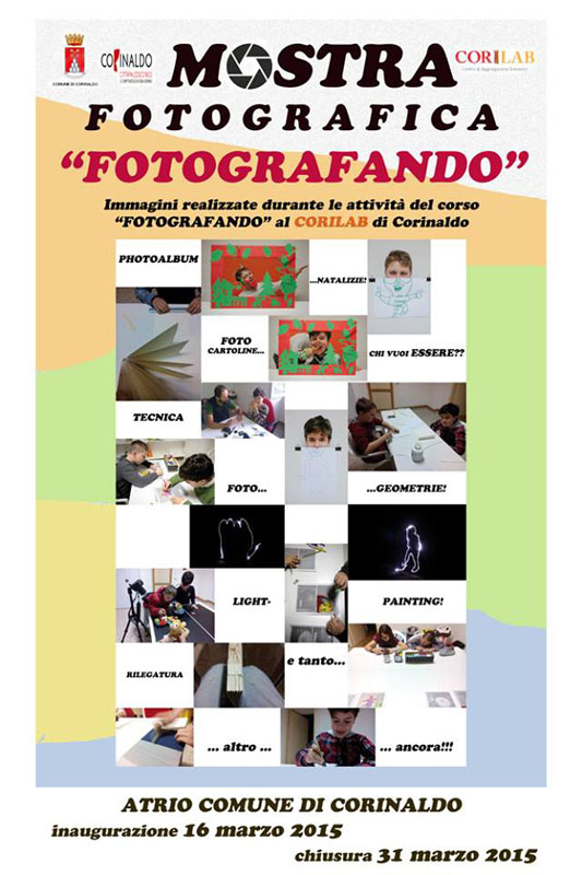 Tra le attività proposte al Corilab, Centro di Aggregazione Giovanile di Corinaldo, è stata realizzata anche quella della fotografia. Ha aperto lunedì 16 marzo 2015 alle ore 17 la mostra delle foto realizzate da un gruppo di ragazzi dai 10 ai 14 anni, che hanno preso parte a questo laboratorio all’interno del Corilab con la supervisione dell’educatore della Cooperativa Sociale H Muta, Gianluca Rossetti.