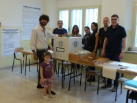 Nella foto il sindaco insieme al presidente del seggio, agli scrutatori ed alla figlia mentre depone la scheda votata nell’urna.