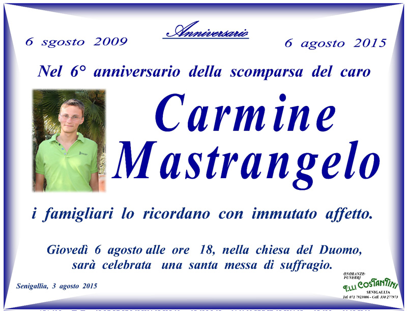 6 agosto 2009 – 6 agosto 2015. Nel sesto anniversario della scomparsa del caro Carmine Mastrangelo, i familiari lo ricordano con immutato affetto.