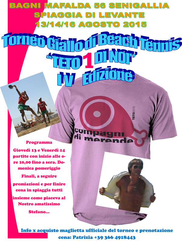 Giovedì 13, venerdì 14 e domenica 16 agosto si svolgerà la quarta edizione del torneo giallo di beach tennis “TETO 1 DI NOI”. L’iniziativa è organizzata da familiari e amici di Stefano Costantini che vogliono ricordarlo con un evento sportivo in suo nome presso i bagni Mafalda n. 56, sul lungomare Alighieri di Senigallia.