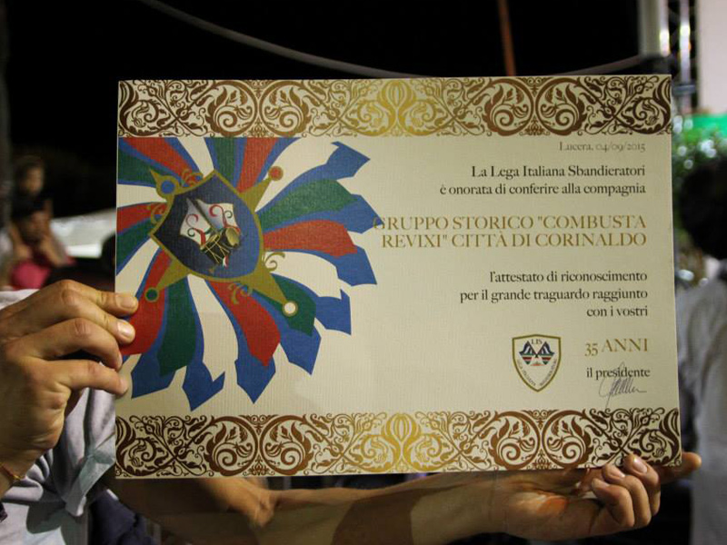 Il Presidente del “Combusta Revixi” Riccardo Massimi rallegrandosi per questi importanti riconoscimenti, sottolinea come le attività del 2015 siano state veramente tante: dalle tante uscite e spettacoli in tante città italiane, alla grandiosa Festa dei Folli, alla preparazione delle esibizioni per le tre Parate Nazionali LIS, ai nuovi spettacoli degli arcieri, musici e sbandieratori con “Francesco, uomo d’Assisi”, all’animazione della Contesa del Pozzo della Polenta, all’organizzazione della Serata Medievale di Pergola, all’organizzazione logistica della Nazionale Italiana Sbandieratori e Musici che ha sede proprio a Corinaldo e per finire la partecipazione straordinaria dei nostri sbandieratori nello spettacolo “Allavita!” del Cirque du Soleil preparato per Milano Expo, in scena da maggio ad agosto per ben 81 serate.