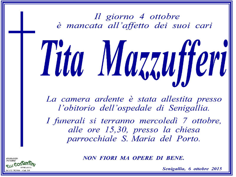 Senigallia: mercoledì 7 ottobre i funerali di Tita Mazzufferi