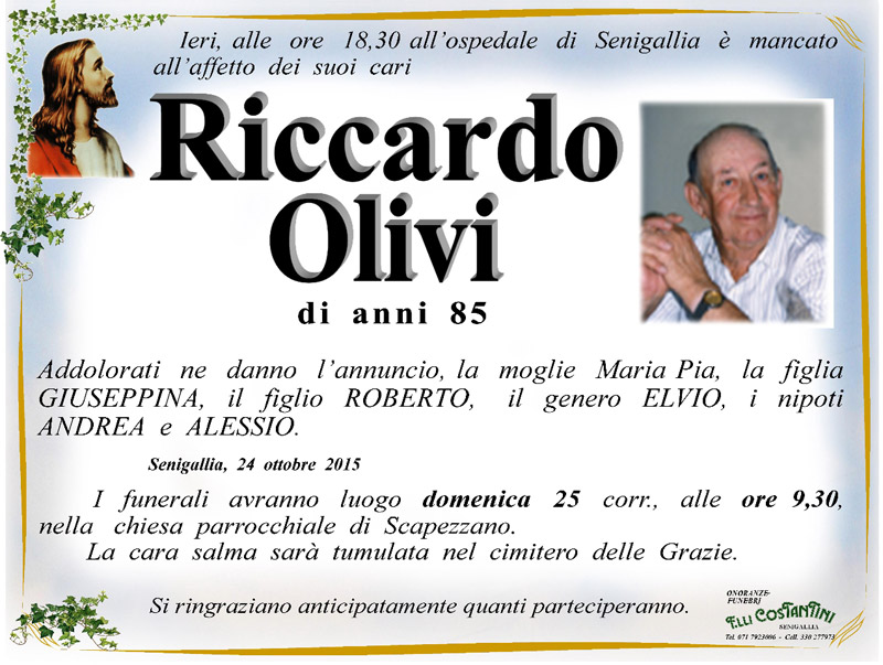 Venerdì 23 ottobre, alle 18:30 presso l’ospedale di Senigallia, è mancato all’affetto dei suoi cari Riccardo Olivi, di 85 anni. Addolorati ne danno l’annuncio la moglie Maria Pia, la figlia Giuseppina, il figlio Roberto, il genero Elvio, i nipoti Andrea e Alessio.