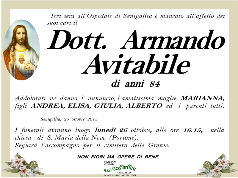 Sabato 24 ottobre, all’ospedale di Senigallia, è mancato all’affetto dei suoi cari il dott. Armando Avitabile, di 84 anni. Addolorati ne danno l’annuncio la moglie Marianna, i figli Andrea, Elisa, Giulia, Alberto e i parenti tutti.