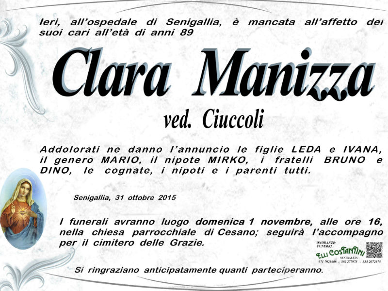 Ieri, all’ospedale di Senigallia, è mancata all’affetto dei suoi cari all’età di anni 89 Clara Manizza ved.Ciuccoli. Addolorati ne danno l’annuncio le figlie Leda e Ivana, il genero Mario, il nipote Mirko, i fratelli Bruno e Dino, le cognate, i nipoti e i parenti tutti.