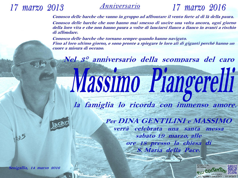 Nel terzo anniversario della scomparsa del caro Massimo Piangerelli, la famiglia lo ricorda con immenso amore. Per Dina Gentilini e Massimo verrà celebrata una messa sabato 19 marzo, alle ore 18, presso la chiesa di S.Maria della Pace