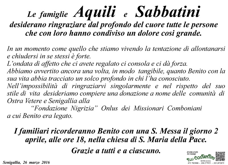 Le famiglie Aquili e Sabbatini desiderano ringraziare dal profondo del cuore tutte le persone che con loro hanno condiviso un dolore così grande.