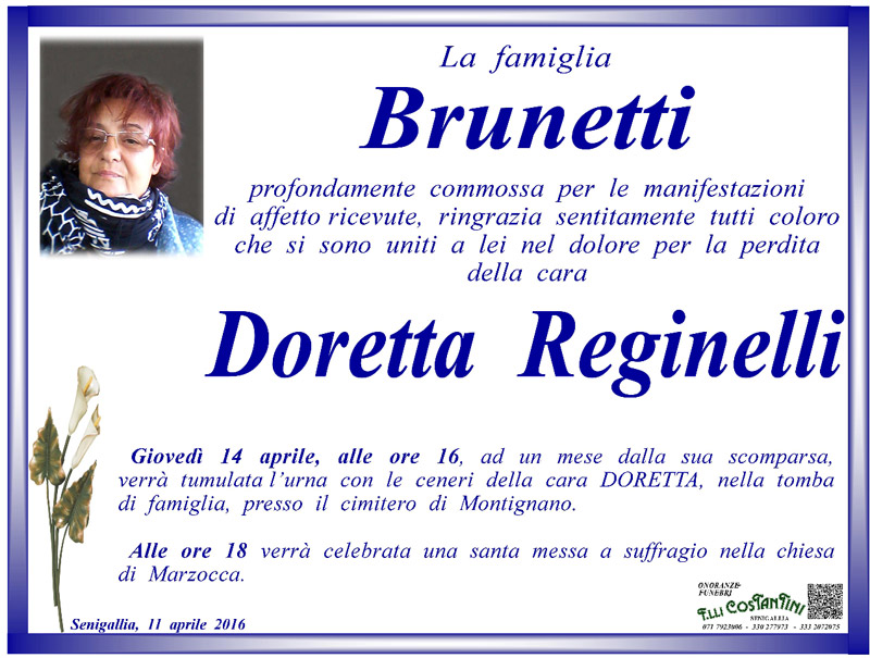 La famiglia Brunetti, profondamente commossa per le manifestazioni di affetto ricevute, ringrazia sentitamente tutti coloro che si sono uniti a lei per la perdita di Doretta Reginelli.