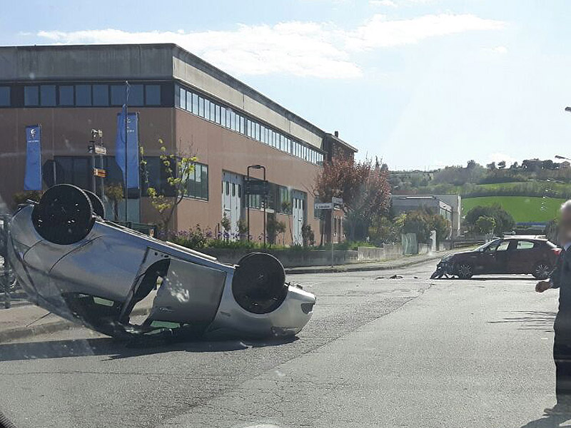Carambola alla Cesanella di Senigallia. Un’auto, a causa dell’impatto con un altro mezzo avvenuto nel primo pomeriggio di giovedì 14 aprile, è cappottata lungo via Lippi.