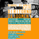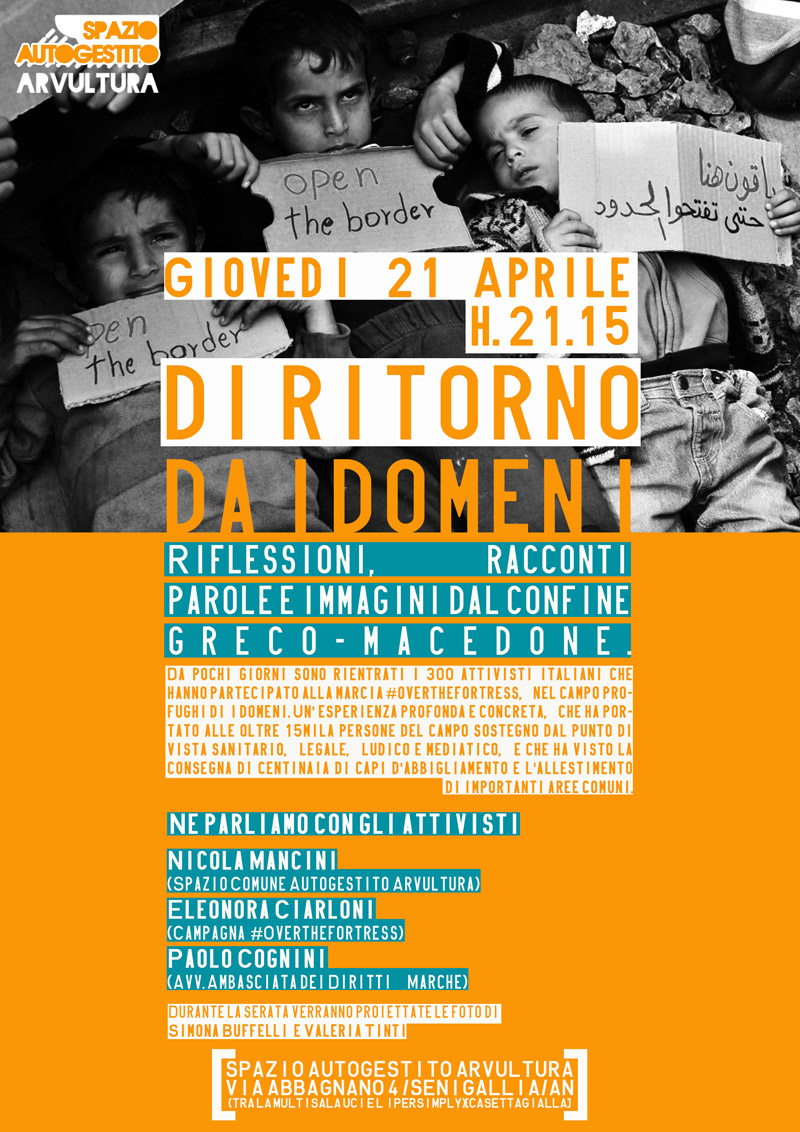 La locandina dell'incontro con gli attivisti di ritorno da Idomeni