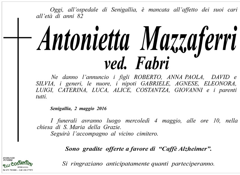 Lunedì 2 maggio, all’ospedale di Senigallia, è mancata all’affetto dei suoi cari all’età di 82 anni Antonietta Mazzaferri, ved. Fabri. Ne danno l’annuncio i figli Roberto, Anna Paola, David e Silvia, i generi, le nuore, i nipoti Gabriele, Agnese, Eleonora, Luigi, Caterina, Luca, Alice, Costanza, Giovanni e i parenti tutti.