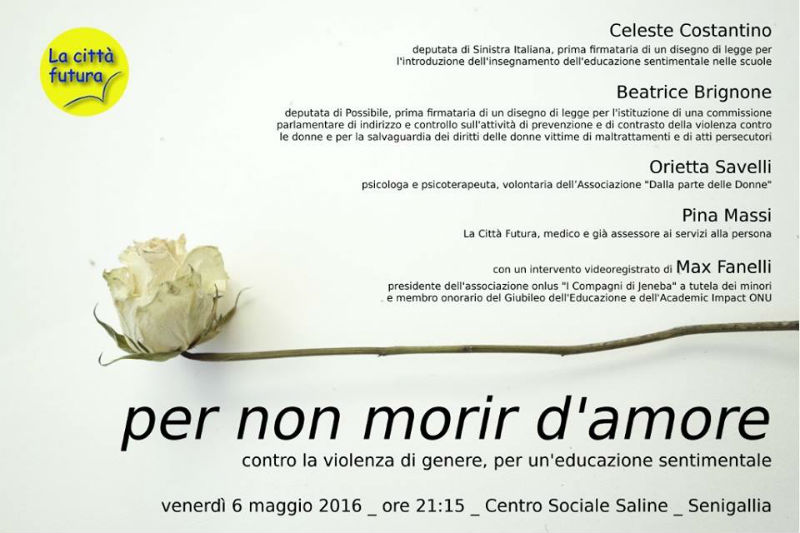 La Città Futura organizza, venerdì 6 maggio 2016 alle ore 21:15 a Senigallia, presso il Centro Sociale Saline, “Per non morir d’amore – contro la violenza di genere, per un’educazione sentimentale”, un incontro di riflessione e proposta, per contrastare e prevenire la violenza di genere attraverso buone leggi.