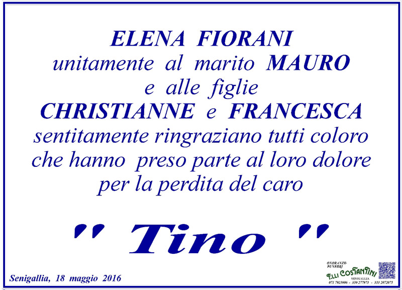 Elena Fiorani, unitamente al marito Mauro e alle figlie Christianne e Francesca, sentitamente ringraziano tutti coloro che hanno preso parte al loro dolore per la perdita del caro “Tino”.
