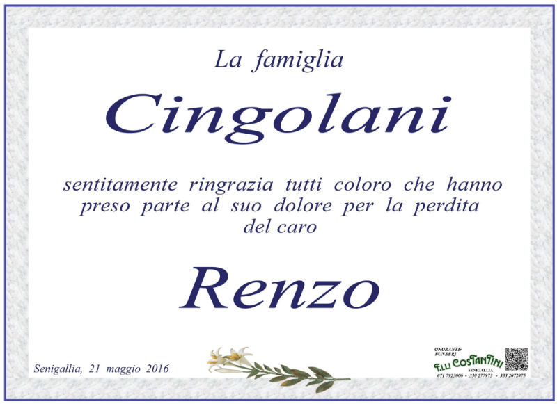 La famiglia Cingolani sentitamente ringrazia tutti coloro che hanno preso parte al suo dolore per la perdita del caro Renzo.