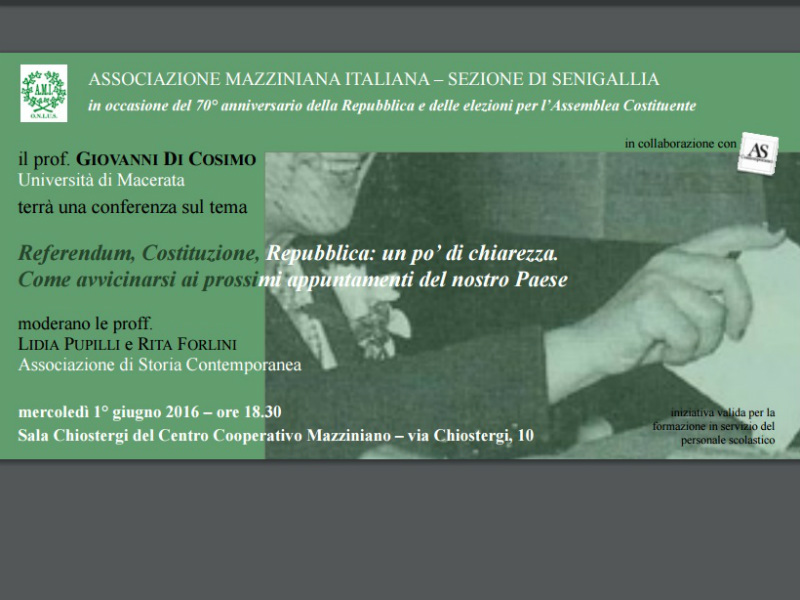 Compie 70 anni la Repubblica Italiana e questa, a dispetto di nostalgici e malelingue, li porta abbastanza bene. Ma quali sono le aspettative dei suoi cittadini verso gli imminenti, cruciali appuntamenti (i referendum autunnali; il cambiamento della carta costituzionale; le capacità di risposta da parte della classe dirigente)? Di questo e altro ancora si parla mercoledì 1° giugno presso la Sala “Chiostergi” del Centro Mazziniano di Senigallia (ore 18.30) con la conferenza del prof. Giovanni Di Cosimo (Università di Macerata) sul tema “Referendum, Costituzione, Repubblica: un po’ di chiarezza. Come avvicinarsi ai prossimi appuntamenti del nostro Paese”.