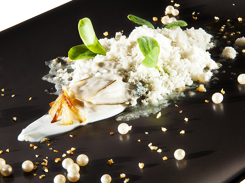 Ostrica con panna acida, scalogno e sorbetto all’ostrica ed olio extravergine di oliva raggia